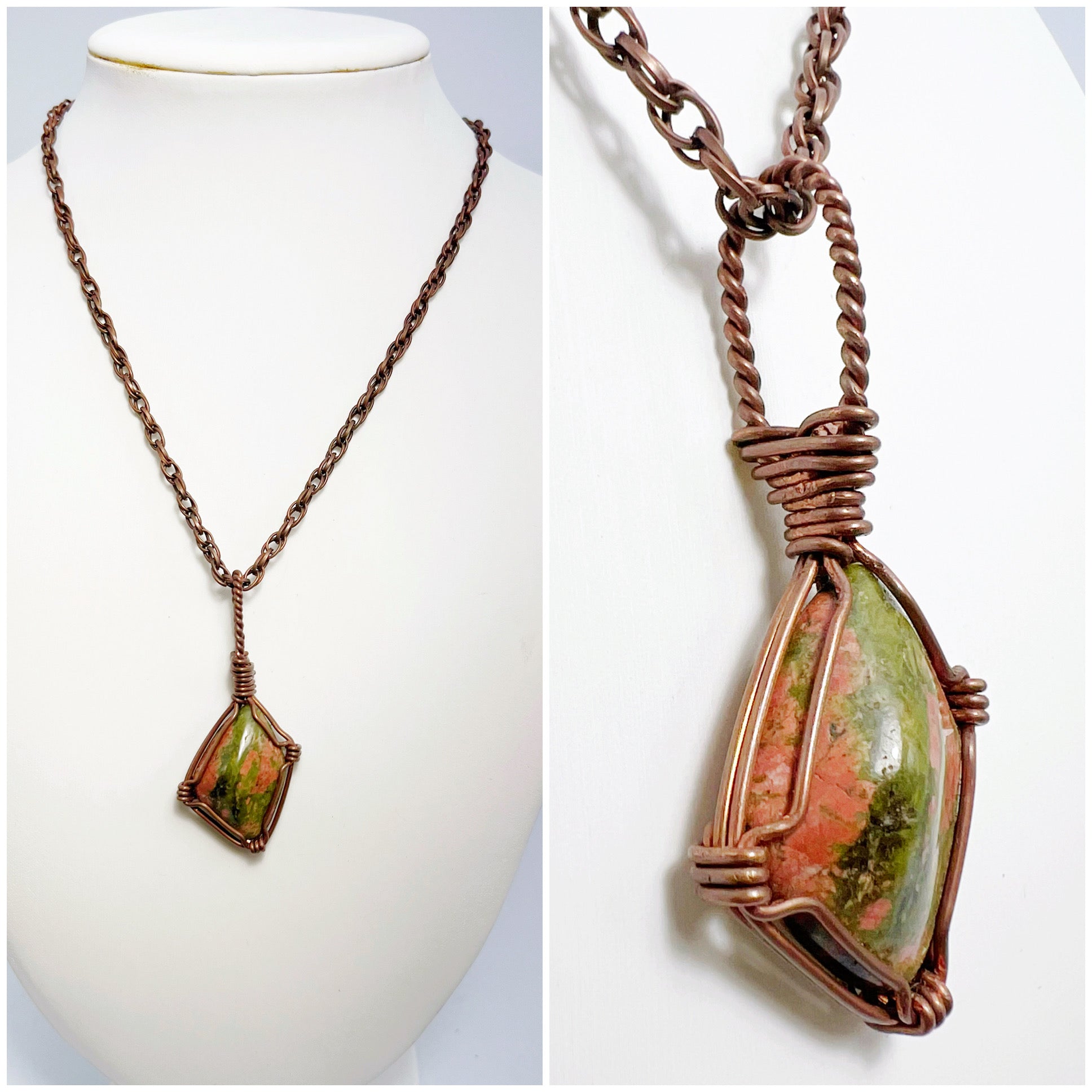 This copper chain necklace features wire wrapped unakite. The chain length is 17” and comes in the gift box shown.