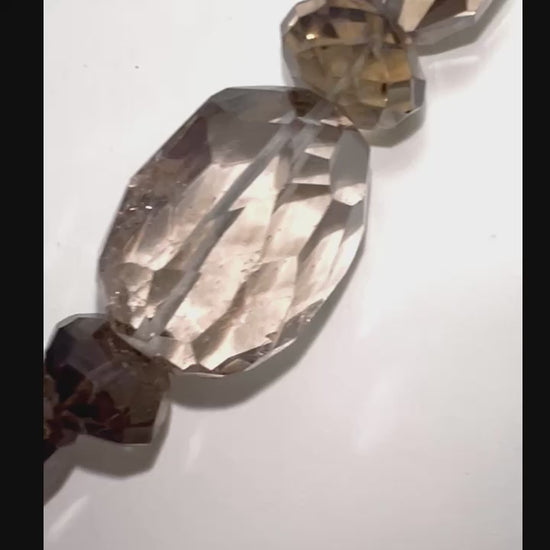 This necklace features beautiful faceted smoky quartz crystals with a stunning floral clasp. Length is approximately 18”. This elegant necklace is perfect to wear with your hair up.